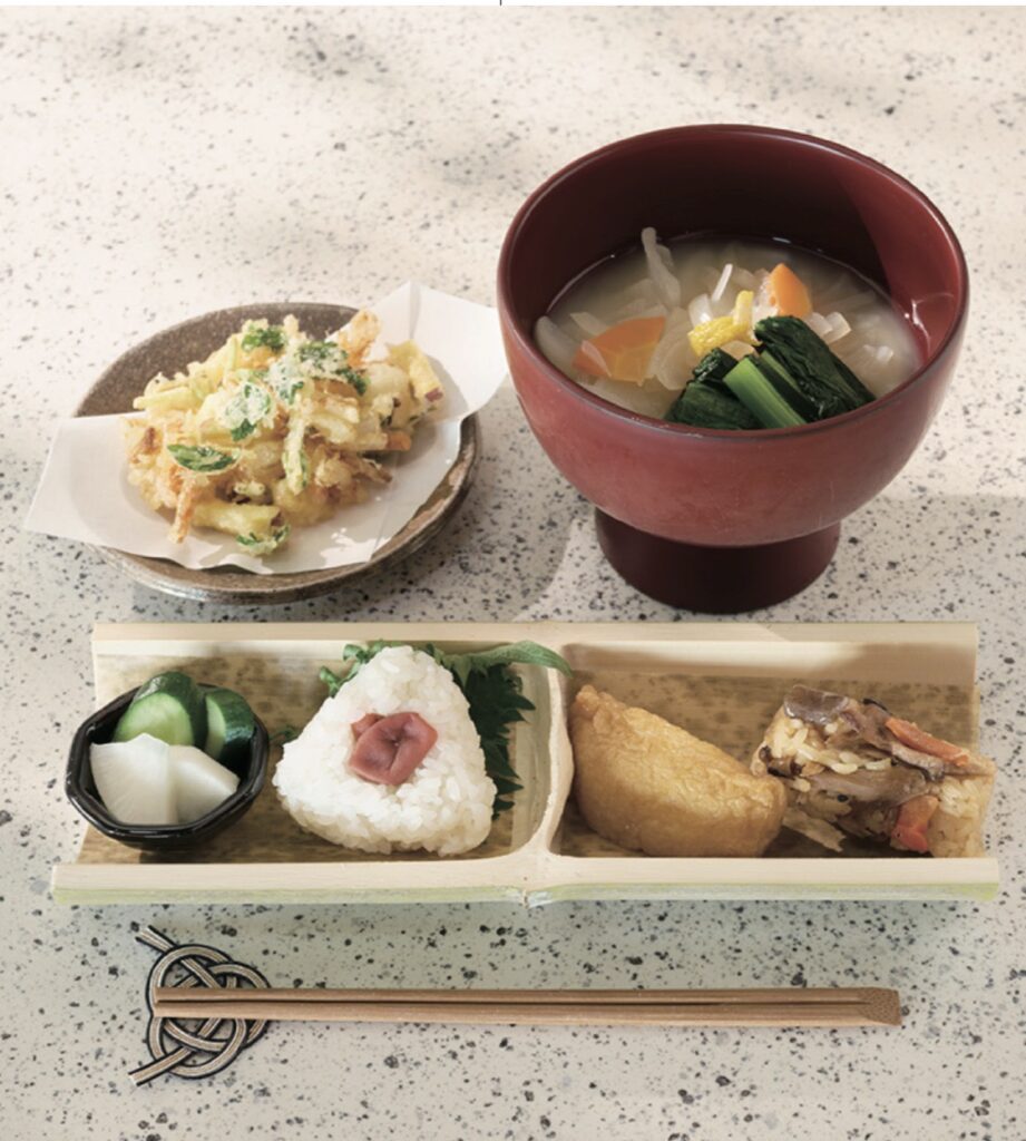 かまどで炊き上げたふっくらおむすびやいなりずしに、自社農園のブランド玉ねぎ「結び玉」を贅沢に使ったサクサクのかき揚げ、そして手づくりの熟成みそを使った具沢山のお味噌汁を添えた看板メニューです。