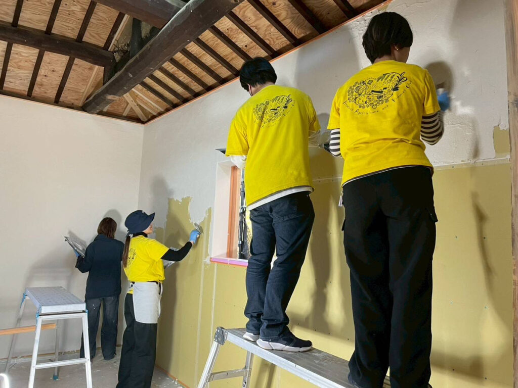 11月下旬には、インターンシップの学生さんとともに、建物内の壁を塗り壁仕上げにする作業を行いました。
