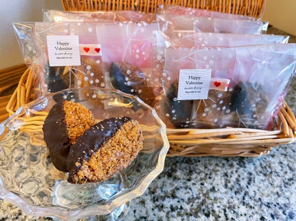 仕上げにスイートチョコレートをコーティングした、バレンタイン限定のリーフパイです。